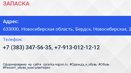 ЗАПАСКА по адресу 633000, Новосибирская область, Бердск, Новосибирская, 2 в дальнейшем Организация, размещена в следующих категориях: