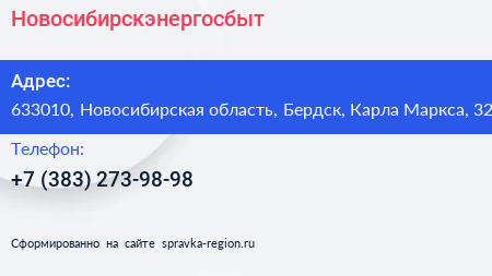 Новосибирскэнергосбыт по адресу 633010, Новосибирская область, Бердск, Карла Маркса, 32 в дальнейшем Организация, размещена в следующих категориях: