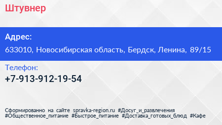 Штувнер по адресу 633010, Новосибирская область, Бердск, Ленина, 89/15 в дальнейшем Организация, размещена в следующих категориях: