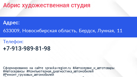 Абрис, художественная студия по адресу 633009, Новосибирская область, Бердск, Лунная, 11 в дальнейшем Организация, размещена в следующих категориях: