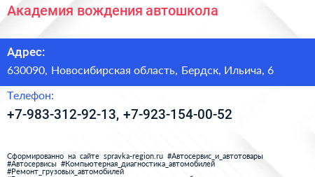 Академия вождения, автошкола по адресу 630090, Новосибирская область, Бердск, Ильича, 6 в дальнейшем Организация, размещена в следующих категориях: