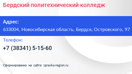 Бердский политехнический колледж по адресу 633004, Новосибирская область, Бердск, Островского, 97 в дальнейшем Организация, размещена в следующих категориях: