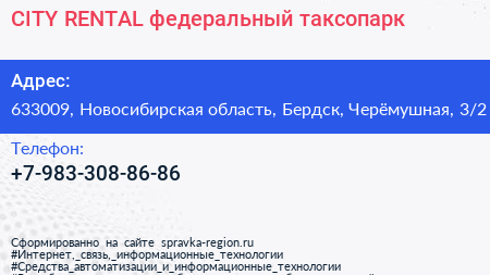 CITY RENTAL, федеральный таксопарк по адресу 633009, Новосибирская область, Бердск, Черёмушная, 3/2 в дальнейшем Организация, размещена в следующих категориях: