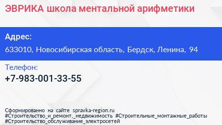 ЭВРИКА, школа ментальной арифметики по адресу 633010, Новосибирская область, Бердск, Ленина, 94 в дальнейшем Организация, размещена в следующих категориях: