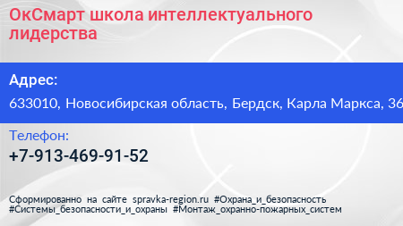 ОкСмарт, школа интеллектуального лидерства по адресу 633010, Новосибирская область, Бердск, Карла Маркса, 36 в дальнейшем Организация, размещена в следующих категориях: