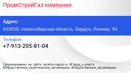 ПромСтройГаз, компания по адресу 633010, Новосибирская область, Бердск, Ленина, 94 в дальнейшем Организация, размещена в следующих категориях: