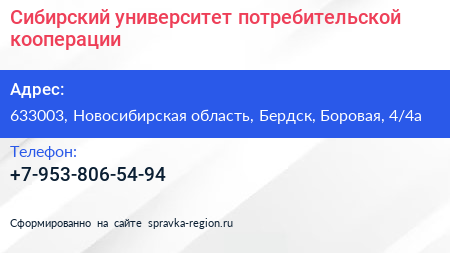 Сибирский университет потребительской кооперации по адресу 633003, Новосибирская область, Бердск, Боровая, 4/4а в дальнейшем Организация, размещена в следующих категориях: