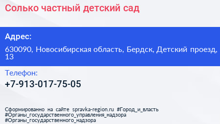 Солько, частный детский сад по адресу 630090, Новосибирская область, Бердск, Детский проезд, 13 в дальнейшем Организация, размещена в следующих категориях: