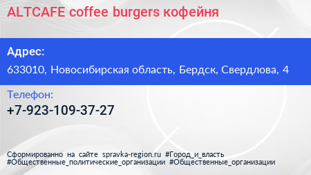 ALTCAFE coffee burgers, кофейня по адресу 633010, Новосибирская область, Бердск, Свердлова, 4 в дальнейшем Организация, размещена в следующих категориях: