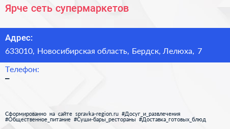 Ярче!, сеть супермаркетов по адресу 633010, Новосибирская область, Бердск, Лелюха, 7 в дальнейшем Организация, размещена в следующих категориях: