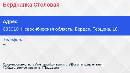 Бердчанка, Столовая по адресу 633010, Новосибирская область, Бердск, Герцена, 18 в дальнейшем Организация, размещена в следующих категориях: