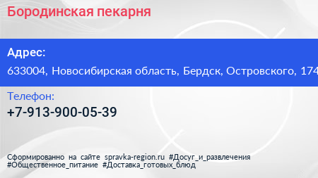 Бородинская, пекарня по адресу 633004, Новосибирская область, Бердск, Островского, 174 в дальнейшем Организация, размещена в следующих категориях: