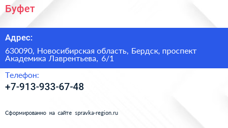 Буфет по адресу 630090, Новосибирская область, Бердск, проспект Академика Лаврентьева, 6/1 в дальнейшем Организация, размещена в следующих категориях:
