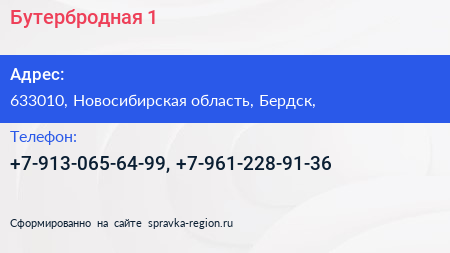 Бутербродная №1 по адресу 633010, Новосибирская область, Бердск, в дальнейшем Организация, размещена в следующих категориях: