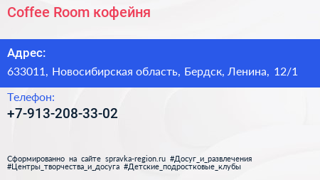 Coffee Room, кофейня по адресу 633011, Новосибирская область, Бердск, Ленина, 12/1 в дальнейшем Организация, размещена в следующих категориях: