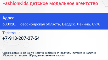 FashionKids, детское модельное агентство по адресу 633010, Новосибирская область, Бердск, Ленина, 89/8 в дальнейшем Организация, размещена в следующих категориях: