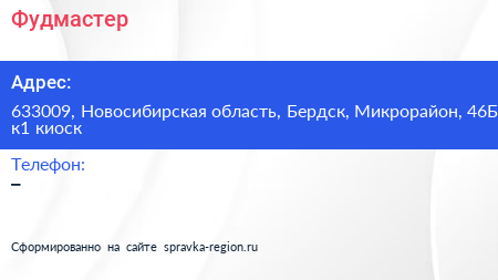 Фудмастер по адресу 633009, Новосибирская область, Бердск, Микрорайон, 46Б к1 киоск в дальнейшем Организация, размещена в следующих категориях: