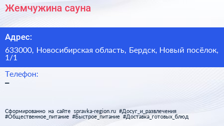 Жемчужина, сауна по адресу 633000, Новосибирская область, Бердск, Новый посёлок, 1/1 в дальнейшем Организация, размещена в следующих категориях: