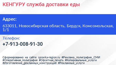 КЕНГУРУ, служба доставки еды по адресу 633011, Новосибирская область, Бердск, Комсомольская, 1/1 в дальнейшем Организация, размещена в следующих категориях: