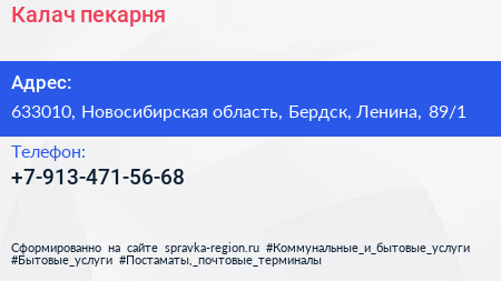 Калач, пекарня по адресу 633010, Новосибирская область, Бердск, Ленина, 89/1 в дальнейшем Организация, размещена в следующих категориях: