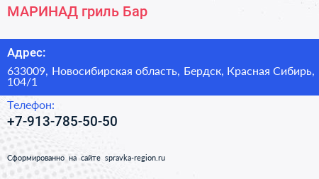 МАРИНАД, гриль-Бар по адресу 633009, Новосибирская область, Бердск, Красная Сибирь, 104/1 в дальнейшем Организация, размещена в следующих категориях: