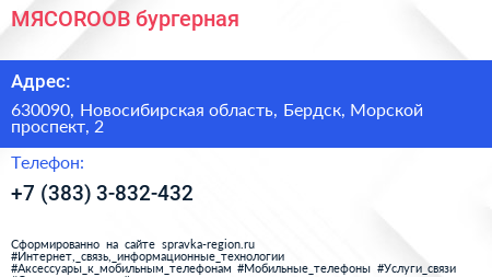 МЯСОROOB, бургерная по адресу 630090, Новосибирская область, Бердск, Морской проспект, 2 в дальнейшем Организация, размещена в следующих категориях: