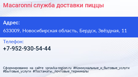 Macaronni, служба доставки пиццы по адресу 633009, Новосибирская область, Бердск, Звёздная, 11 в дальнейшем Организация, размещена в следующих категориях: