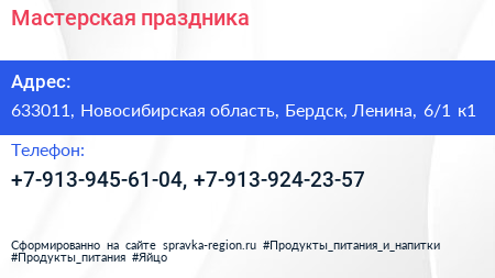 Мастерская праздника по адресу 633011, Новосибирская область, Бердск, Ленина, 6/1 к1 в дальнейшем Организация, размещена в следующих категориях: