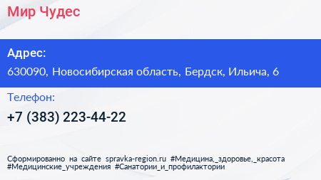 Мир Чудес по адресу 630090, Новосибирская область, Бердск, Ильича, 6 в дальнейшем Организация, размещена в следующих категориях: