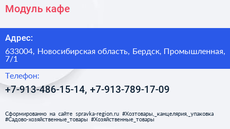 Модуль, кафе по адресу 633004, Новосибирская область, Бердск, Промышленная, 7/1 в дальнейшем Организация, размещена в следующих категориях: