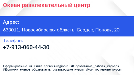 Океан, развлекательный центр по адресу 633011, Новосибирская область, Бердск, Попова, 20 в дальнейшем Организация, размещена в следующих категориях:
