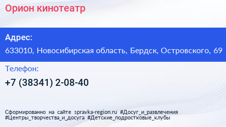 Орион, кинотеатр по адресу 633010, Новосибирская область, Бердск, Островского, 69 в дальнейшем Организация, размещена в следующих категориях: