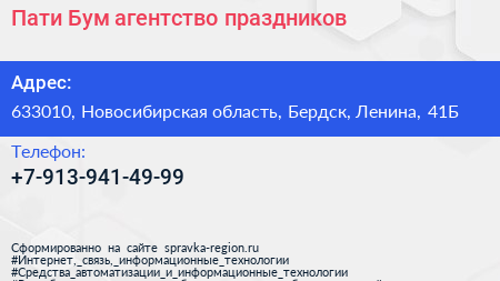 Пати Бум, агентство праздников по адресу 633010, Новосибирская область, Бердск, Ленина, 41Б в дальнейшем Организация, размещена в следующих категориях: