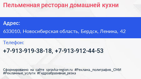 Пельменная, ресторан домашней кухни по адресу 633010, Новосибирская область, Бердск, Ленина, 42 в дальнейшем Организация, размещена в следующих категориях: