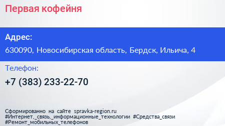 Первая кофейня по адресу 630090, Новосибирская область, Бердск, Ильича, 4 в дальнейшем Организация, размещена в следующих категориях: