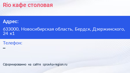 Rio, кафе-столовая по адресу 633000, Новосибирская область, Бердск, Дзержинского, 24 к1 в дальнейшем Организация, размещена в следующих категориях: