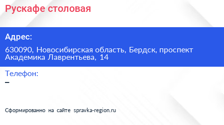 Рускафе, столовая по адресу 630090, Новосибирская область, Бердск, проспект Академика Лаврентьева, 14 в дальнейшем Организация, размещена в следующих категориях: