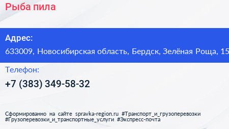Рыба-пила по адресу 633009, Новосибирская область, Бердск, Зелёная Роща, 15 в дальнейшем Организация, размещена в следующих категориях: