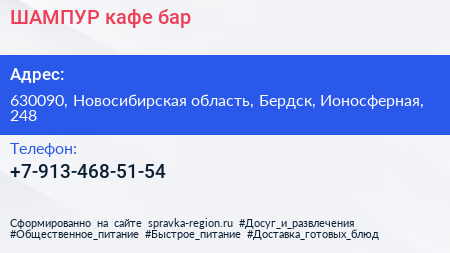 ШАМПУР, кафе-бар по адресу 630090, Новосибирская область, Бердск, Ионосферная, 248 в дальнейшем Организация, размещена в следующих категориях: