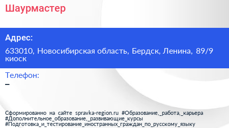 Шаурмастер по адресу 633010, Новосибирская область, Бердск, Ленина, 89/9 киоск в дальнейшем Организация, размещена в следующих категориях: