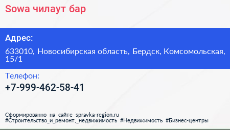 Sowa, чилаут-бар по адресу 633010, Новосибирская область, Бердск, Комсомольская, 15/1 в дальнейшем Организация, размещена в следующих категориях: