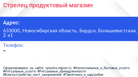 Стрелец, продуктовый магазин по адресу 633000, Новосибирская область, Бердск, Большевистская, 2 к1 в дальнейшем Организация, размещена в следующих категориях: