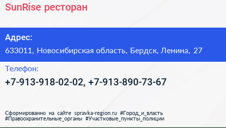SunRise, ресторан по адресу 633011, Новосибирская область, Бердск, Ленина, 27 в дальнейшем Организация, размещена в следующих категориях: