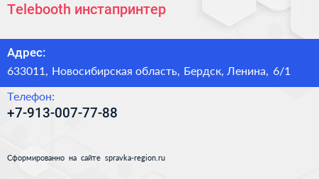 Telebooth, инстапринтер по адресу 633011, Новосибирская область, Бердск, Ленина, 6/1 в дальнейшем Организация, размещена в следующих категориях:
