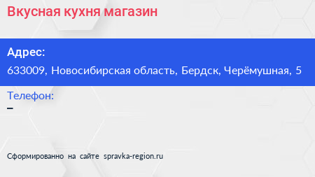 Вкусная кухня, магазин по адресу 633009, Новосибирская область, Бердск, Черёмушная, 5 в дальнейшем Организация, размещена в следующих категориях:
