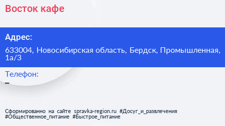 Восток, кафе по адресу 633004, Новосибирская область, Бердск, Промышленная, 1а/3 в дальнейшем Организация, размещена в следующих категориях: