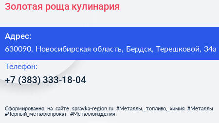 Золотая роща, кулинария по адресу 630090, Новосибирская область, Бердск, Терешковой, 34а в дальнейшем Организация, размещена в следующих категориях: