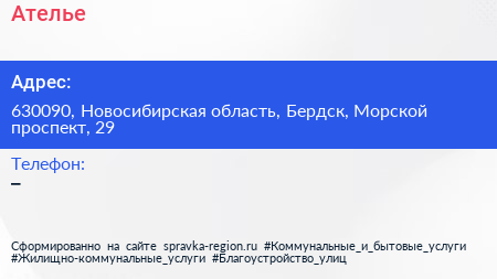 Ателье по адресу 630090, Новосибирская область, Бердск, Морской проспект, 29 в дальнейшем Организация, размещена в следующих категориях: