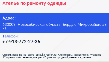 Ателье по ремонту одежды по адресу 633009, Новосибирская область, Бердск, Микрорайон, 58 к1 в дальнейшем Организация, размещена в следующих категориях: