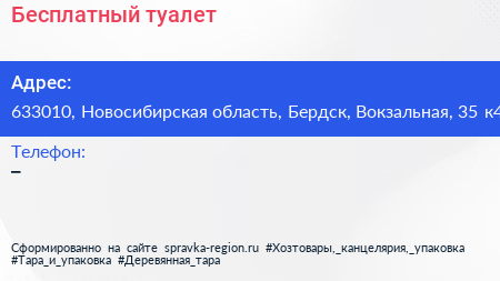 Бесплатный туалет по адресу 633010, Новосибирская область, Бердск, Вокзальная, 35 к4 в дальнейшем Организация, размещена в следующих категориях: